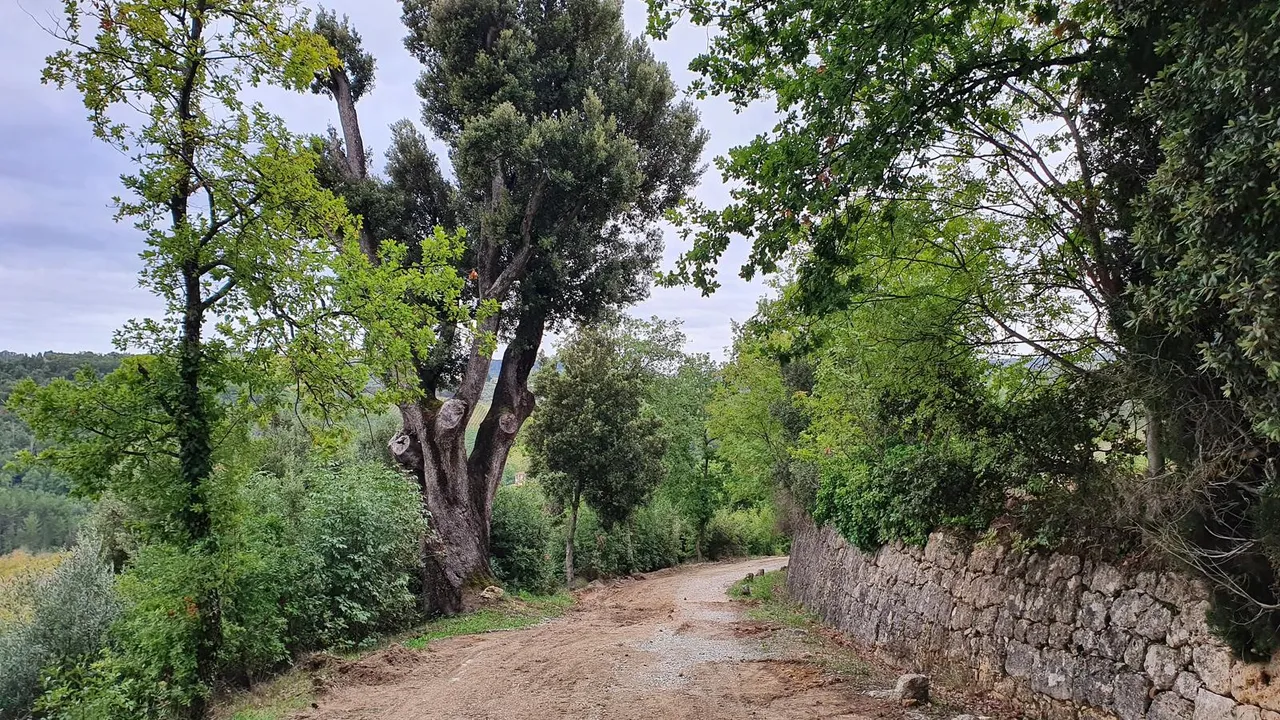 오크나무 아래에 아기자기한 마을이 보이는 고요한 시골 길을 걷게 될 것입니다.